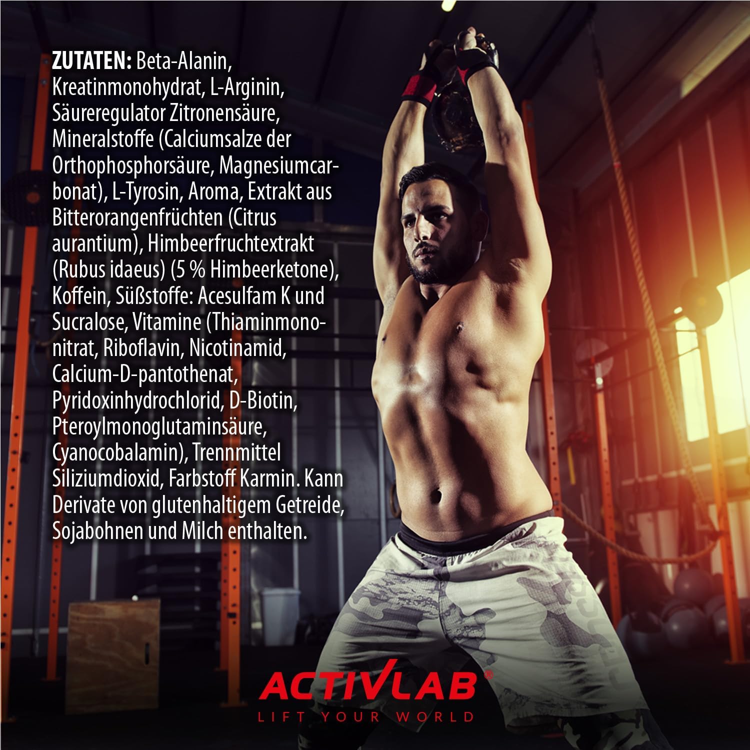 Beta-Alanin, Dextrose, L-Arginin, Säureregulator Citronensäure, Mineralstoffe (Calciumsalze der Orthophosphorsäure, Magnesiumcarbonat), L-Tyrosin, Bitterorangenfruchtpulver (Citrus aurantium), Koffein, Himbeerfruchtpulver (Rubus idaeus, 5 % Himbeerketone), Aromen, Süßungsmittel Acesulfam K und Sucralose, Vitamine (Thiaminmononitrat, Riboflavin, Nicotinamid, Calcium-D-Pantothenat, Pyridoxinhydrochlorid, D-Biotin, Pteroylmonoglutaminsäure, Cyanocobalamin), Trennmittel Siliciumdioxid, Farbstoff Carotine.