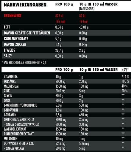 Gamma-Aminobuttersäure (GABA) ist ein Neurotransmitter, der für die Entspannung des Nervensystems und das Signal der Müdigkeit verantwortlich ist. Ein niedriger GABA-Spiegel kann mit Schlaflosigkeit in Verbindung stehen. GABA hat eine begrenzte Bioverfügbarkeit im Gehirn, da es schwer durch die Blut-Hirn-Schranke gelangt. Zur Verbesserung der Bioverfügbarkeit enthält Rest in Peace zusätzlich Ornithin, L-Norvalin und Pinienrinden-Extrakt.