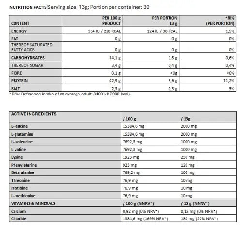 EAA Pro Amino Blend (L-Leucin, L-Glutamin, L-Isoleucin, L-Valin, L-Lysin, L-Phenylalanin, Beta-Alanin, L-Threonin, L-Histidin, L-Methionin), Aromen, Süßstoffe (Sucralose, Acesulfam-K), Säureregulator (Apfelsäure), Trennmittel (Calciumsilikat, Tricalciumphosphat, Siliciumdioxid, Maltodextrin), Magnesiumcitrat, Natriumchlorid, Trikaliumcitrat, Kokoswasser-Extrakt, Vitamin C, Astragalus membranaceus-Extrakt, Panax Ginseng-Extrakt, Taurin, AstraGin®, Niacin, Pantothensäure, Vitamin B6, Farbstoff (Brillantblau), Vitamin B2, Vitamin B1, Vitamin B12.