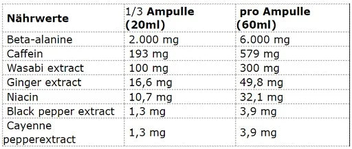 Wasser, Beta-Alanin, Säureregulator (Citronensäure), Koffein, Aromen, Wasabi-Wurzel-Extrakt, Ingwer-Rhizom-Extrakt, Nicotinamid (Niacin), Konservierungsstoff (Sorbinsäure), Süßungsmittel (Acesulfam K, Sucralose, Cyclamat), Schwarzer Pfeffer-Frucht-Extrakt, Cayennepfeffer-Frucht-Extrakt, Farbstoff (Echtes Karmin).