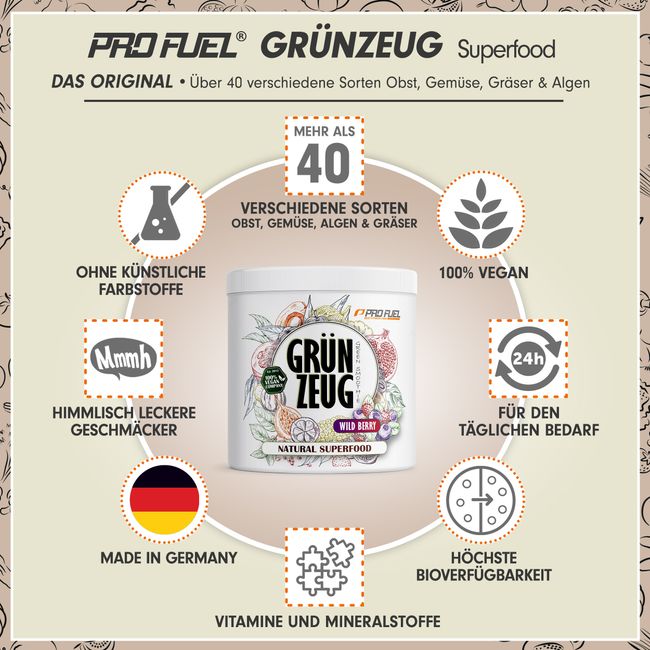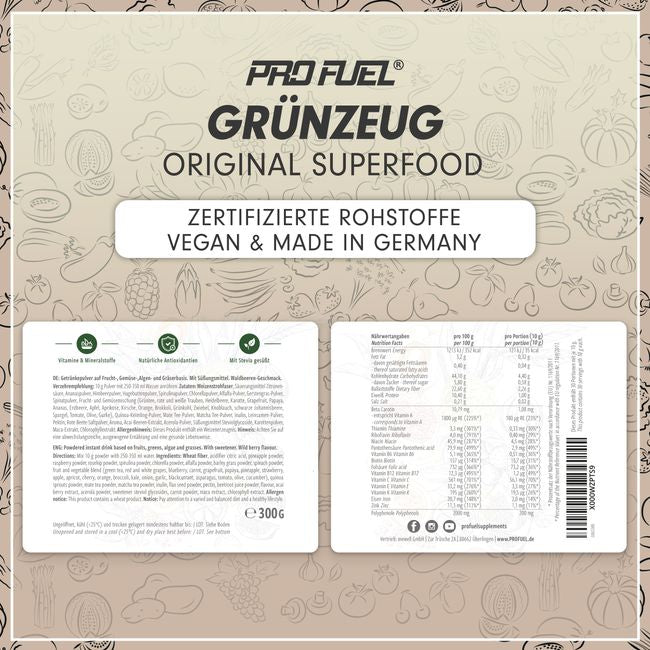 GRÜNZEUG ist ein hochwertiges Superfoods-Pulver mit über 40 Sorten Obst, Gemüse, Algen und Gräsern. Ob als erfrischender Drink oder als Zusatz für Smoothies – das Pulver liefert wertvolle natürliche Vitamine, Mineralstoffe und Antioxidantien. Es ist die ideale Ergänzung für alle, die ihren Körper auf natürliche Weise mit wichtigen Vitalstoffen unterstützen möchten.